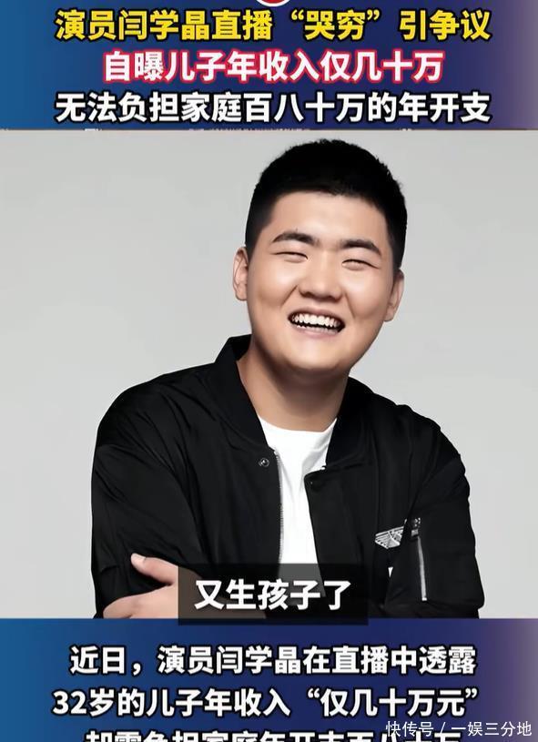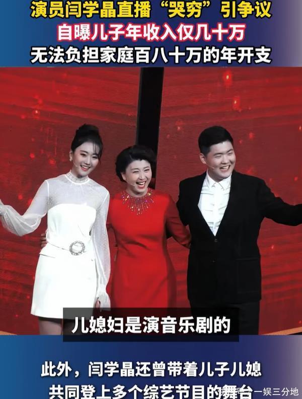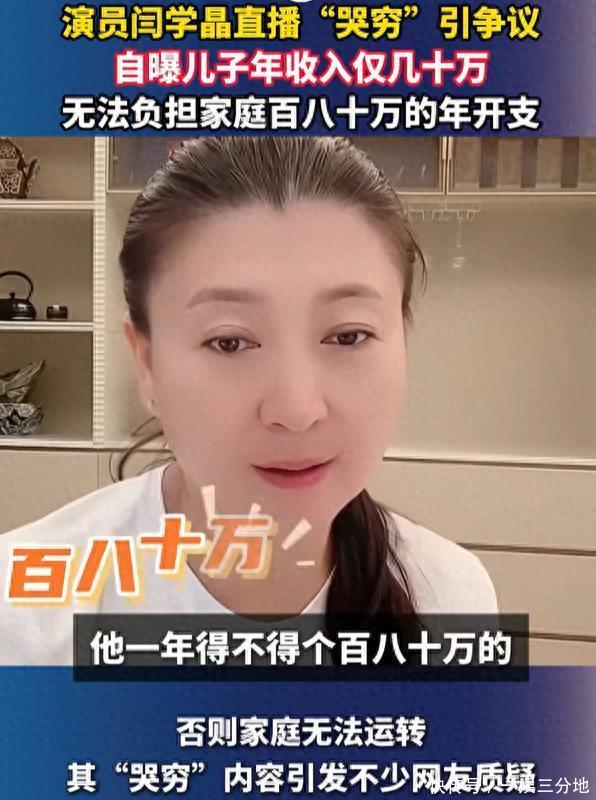 明星的“贫困”,确实普通人的“天花板” 闫学晶在直播间里算了这样一笔账:儿子拍戏每年能挣二三十万,儿媳妇是搞音乐剧的每年挣不到十万,小两口合计不到四十万的年收入。 但是在首都北京,他们需要扛房贷、养育孩子、教育开支等至少五六十万,零零总总加起来儿子一年没有百八十万根本转不过来…… 闫学晶是心疼儿子,这没错! 可是,她的哭穷似乎是用错了地方,直播时面对的是百万围观的普通老百姓,这些人里有几个活得比你一个明星松快?