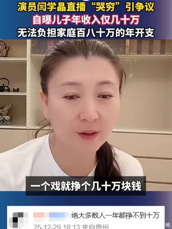 有人还给她算了另一笔账:自己名下在北京平米的大平层,市价至少两千万,海南三亚两套房,单秒广告报万,再加上直播带货、商业演出、拍戏等待,年收入不下千万吧? 这哪里是哭穷,这是在凡尔赛炫富吧? 明星的“贫困”,在普通老百姓这里已经是“天花板”了。国家统计局数据显示,2023年全国居民人均可支配收入.7万元,北京社平工资年万。 一年能挣四五十万已经是普通人躺被窝里要笑醒的事儿,而是到了明星那里却成了“活不下去”的坎了,你说尴尬不尴尬? 为什么明星“哭穷”让人反感 闫学晶的哭穷之所以招人反感,核心是明星圈层与普通人的认知彻底脱节! 她建议儿子“走投无路就去横店闯闯”,在她眼里横店是“下策”! 可对无数怀揣梦想的横漂来说,那里是拼尽全力才能争取到一个路人甲角色的舞台,是拿着日薪百八十块、挤在集体宿舍里的生存之地……